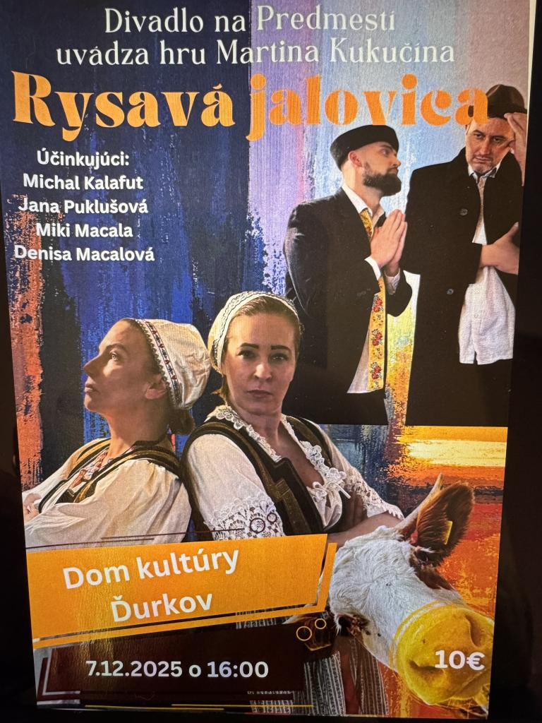 Dňa 7. decembra 2025 o 16:00 hod. sa v Kultúrnom dome Ďurkov uskutoční predstavenie, ktoré prinesie divákom jedinečný kultúrny zážitok. Všetkých záujemcov pozývame, aby si nenechali ujsť túto skvelú príležitosť a prišli si užiť večer plný umenia. Tešíme sa na vašu účasť a veríme, že predstavenie vás nadchne. Vstupné 10€