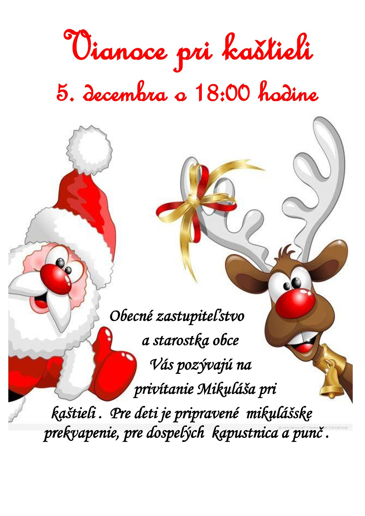 Obecné zastupiteľstvo a starostka obce Vás pozývajú na privítanie Mikuláša pri kaštieli . Pre deti je pripravené mikulášske prekvapenie, pre dospelých kapustnica a punč .